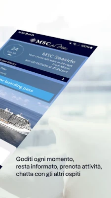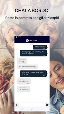 Una volta a bordo, MSC for Me continua a rendere la tua esperienza fluida e gratificante. Rimani connesso senza sforzo con i tuoi cari grazie alla funzionalità di chat integrata, un modo semplice e gratuito per comunicare con i tuoi compagni di viaggio. Mai più un momento perso: l'app ti permette di navigare tra l'ampio calendario di attività, prenotare il tuo posto e ricevere notifiche personalizzate direttamente sul tuo smartphone per ricordarti appuntamenti ai ristoranti, orari delle escursioni a terra o dettagli sui tuoi acquisti. Avrai inoltre la libertà di scegliere il pacchetto internet più adatto alle tue esigenze e di gestirne il consumo con pochi tocchi, mantenendoti sempre aggiornato e in contatto con il mondo esterno, se lo desideri.