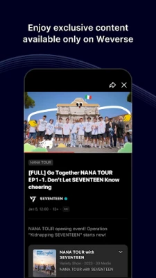 Scopri l'universo senza confini dei tuoi artisti preferiti con Weverse, il luogo dove ogni momento diventa un'opportunità di connessione profonda. Immergiti nelle loro giornate attraverso post esclusivi, lascia un commento o un "Mi piace" per mostrare il tuo apprezzamento. Non lasciare che le barriere linguistiche ti fermino: la nostra funzione di traduzione automatica abbatte ogni ostacolo, permettendoti di comprendere i fan di tutto il mondo e di interagire con i contenuti degli artisti nella tua lingua preferita, trasformando Weverse nel tuo passaporto per una comunità globale vibrante e interattiva.